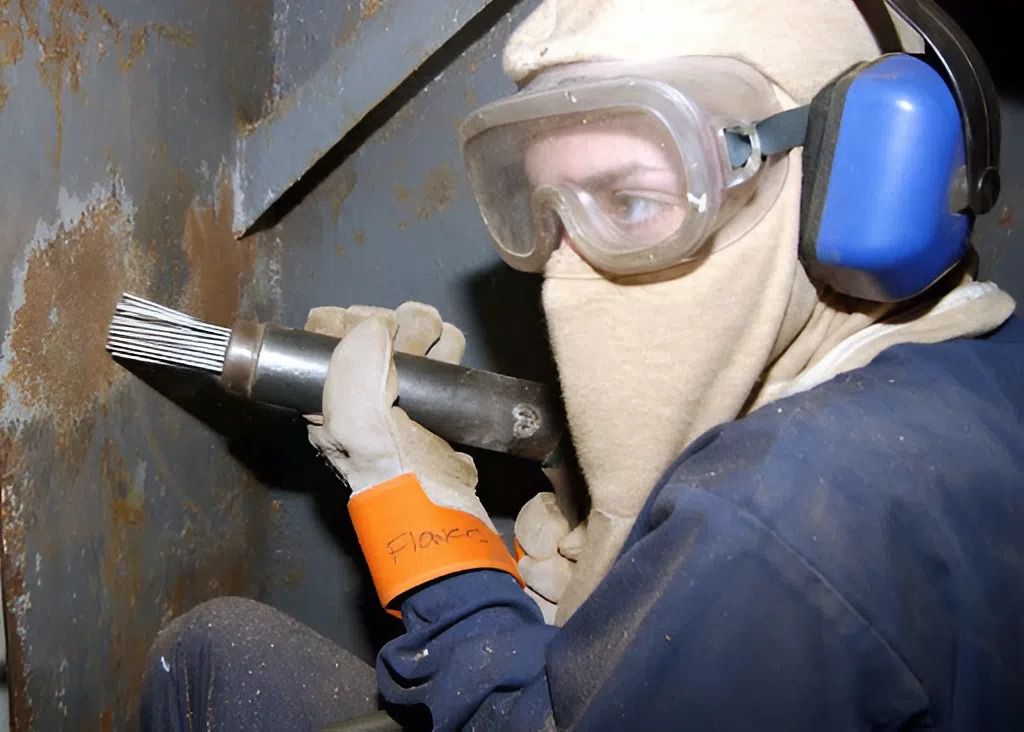 Người trong nghề đều hiểu rằng, trang bị bảo hộ là điều bắt buộc chứ không phải tùy chọn. Khi cầm đến súng gõ rỉ, điều đầu tiên phải nghĩ đến là bảo hộ cá nhân. Kính che kín mắt, găng tay chống cắt, khẩu trang N95 hoặc P100 tùy môi trường và nút tai chống ồn là tối thiểu. Thiếu một trong các thứ này, bạn sẽ thấy hậu quả ngay sau vài ca làm việc dài.